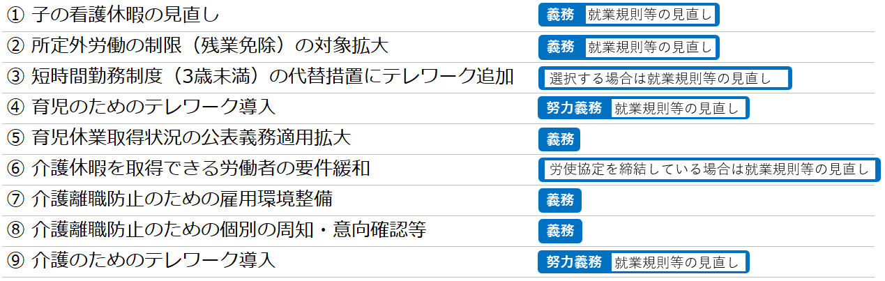 | 義務 | 3歳に満たない子を養育する労働者に関し、育児短時間勤務制度を講ずることが困難な場合の代替措置の選択肢の1つにテレワークが追加されました。 |