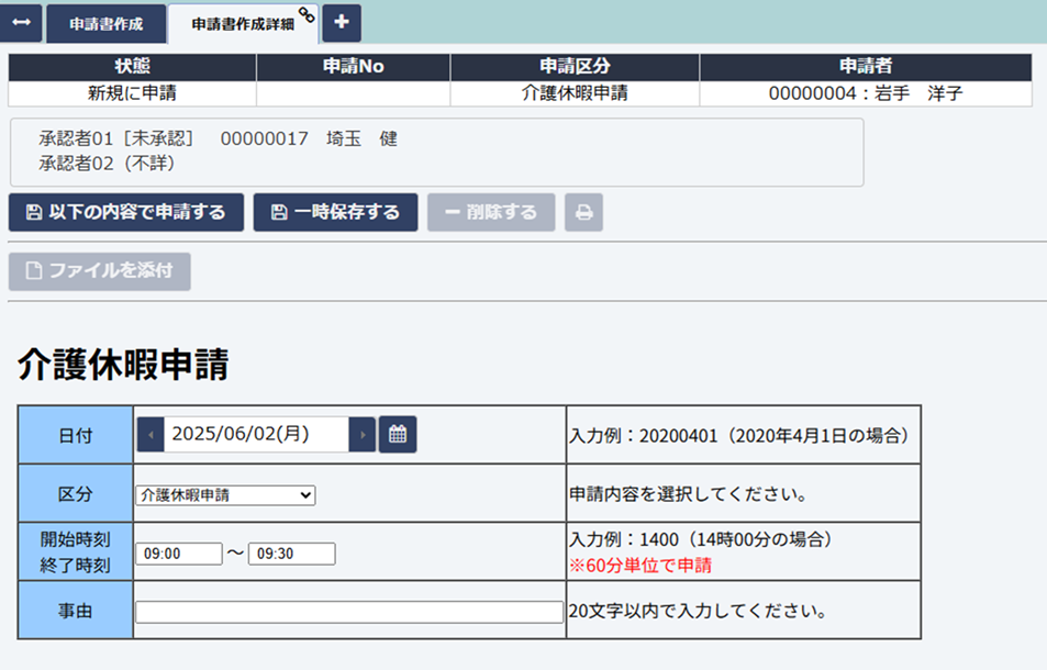 社外勤務での出勤/退勤、休憩開始/終了、1日単位や時間単位、分単位で取得できる休暇申請などの業務を電子化するワークフロー機能を標準搭載しています。 |