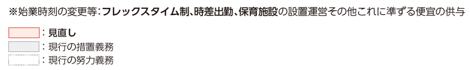 | 義務 | 事業主は3歳から小学校就学前の子を養育する労働者に対して、職場のニーズを把握した上で、次の5つの中から2つ以上の措置を選択して講じなければなりません。 |