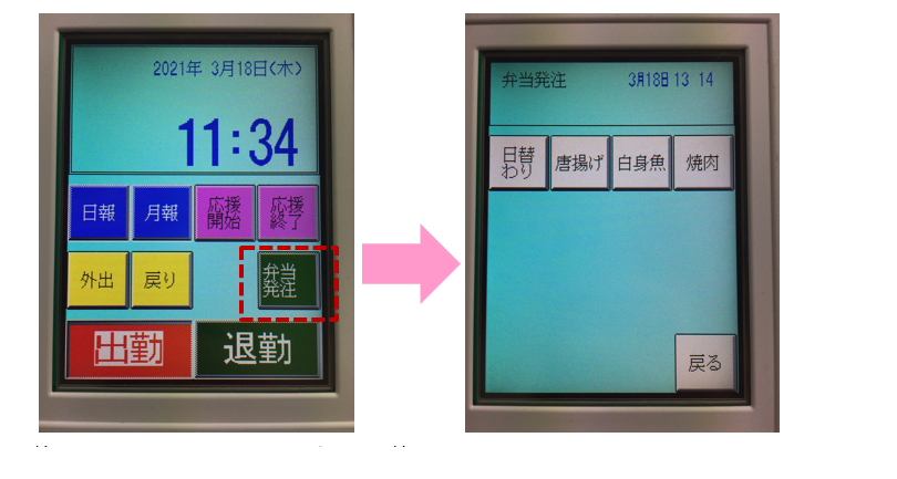 出勤打刻と同時に、食事予約が可能です。もちろん、予約締切時間以降では予約ボタンが表示されませんので、安心です。
