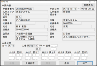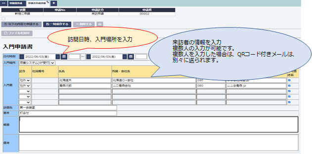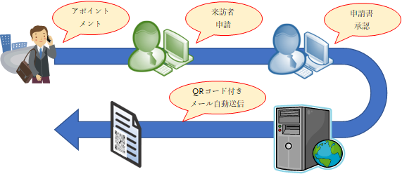 - 担当者は、アポイントメントの内容を登録し、申請します。(日時、訪問先、要件、訪問者の情報など)