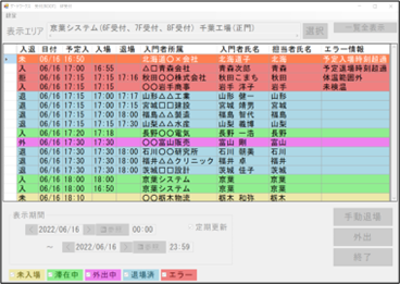 今日の来訪者の一覧を表示します。未入場、入場中、退場済み、外出中などの状態が一目でわかります。