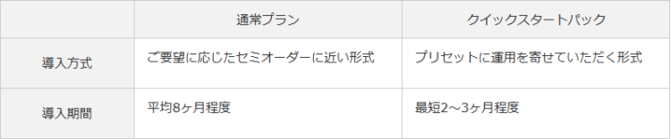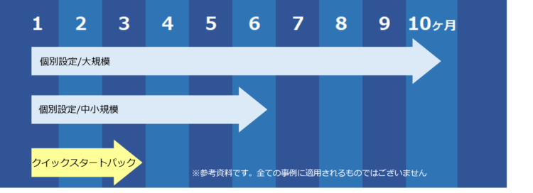 弊社で約50年以上に渡るシステム開発、導入作業の中で培ったノウハウから多くのユーザー様でご利用頂ける設定をパック化しました。クイックスタートパックの設定内容をご利用いただく事で短期間かつローコスト形式で導入が可能なプランとなります。運用が合わない部分については、設定変更での対応をする事が可能です。