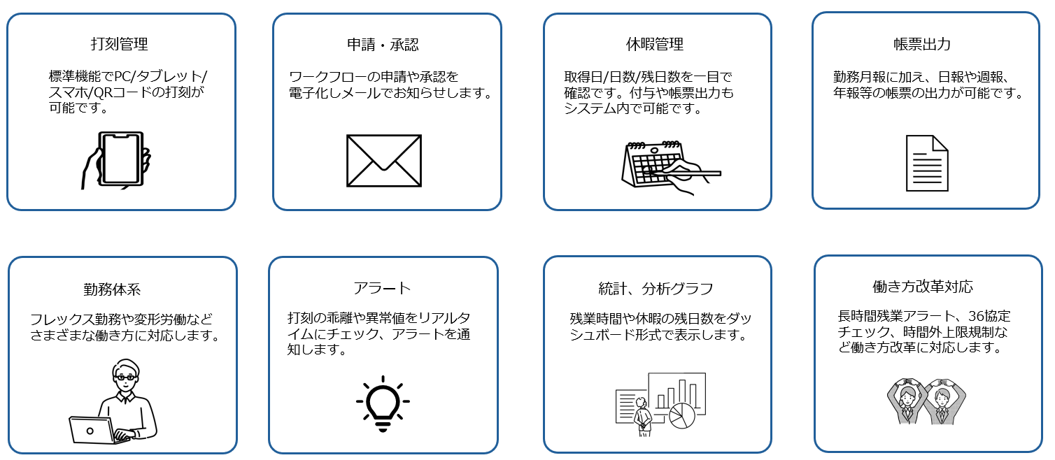 クイックスタートパックは、標準的な残業時間や休暇の管理などに加え、フレックス勤務や変形労働、リモートワークなど働き方の多様化への対応も可能です。